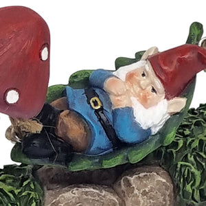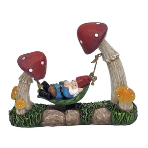 Time for a nap! Which is a common occurrence for these sleepy gnomes! This little fellow has strung up his hammock between two little red capped mushrooms. He sports brown trousers with black boots, and a blue coat. He has, of course, a long white flowing beard and his head is topped with a red pointy hat. He clasps his hands upon his chest as he prepares to drift off to sleep peacefully.