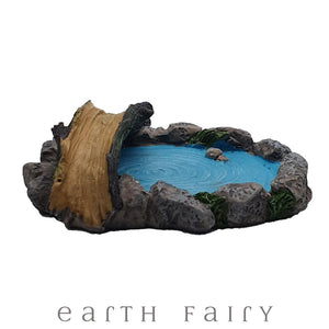 A little pond of blue water edged with rocks and including a small tree branch bridge to fish from.