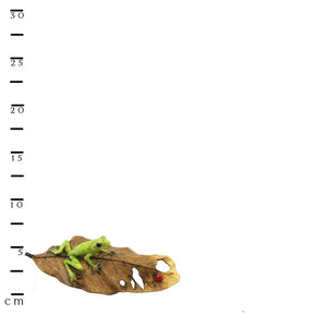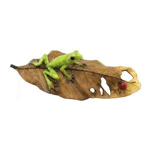 This frog has paused to observe the tiniest of ladybugs, perched at the end of his leaf. A beautifully detailed piece for any fairy garden or miniature scene.