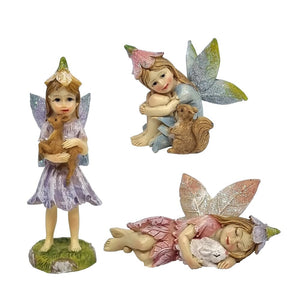 Adorable, flower topped garden fairies, each posed with a different animal.
