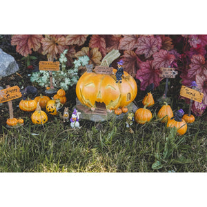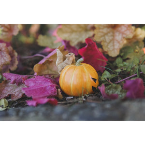 Companion piece to the The Witch's Black Cat in a Jack o' Lantern, this cat is now depicted receiving a mighty scare himself! Perched on a big pumpkin jack o' lantern, his arched back and big eyes are caught in perfect detail. There are many other companion pieces to decorate with from our Halloween Collection. Just a super cute addition to your fairy garden! From our Enchanted Story collection.