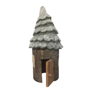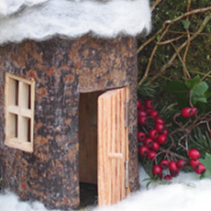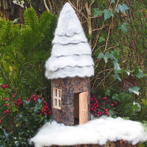 Hollowed out wooden trunk, with door and 2 windows added, completed by a snowy roof. Each one is of course individual as this product is made from real wood. Please note: wood may crack over time, this is a natural product and the bark may separate from the trunk, especially if little fingers are pulling at it. The play value is not diminished by these natural occurrences, in fact, it enhances the product. The snowy felt roof sits on top loosely and can be taken of to reveal the attic!