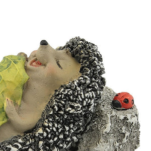 A special character in the fairy garden landscape, the hedgehog is as cute as he is friendly. Posed here sleeping on a rock with a little leaf for a blanket.