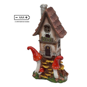 This charming toadstool manor will add a touch of whimsy to your home or fairy garden. With a shingled roof and decorative details, the toadstool manor makes a wonderful addition to any miniature scene. A little chimney add a sense of reality. The house contains battery powered LED lights, which enables you to light up your nights with a wonderful glow, giving you more than just one extra fun way to display this cottage.
