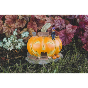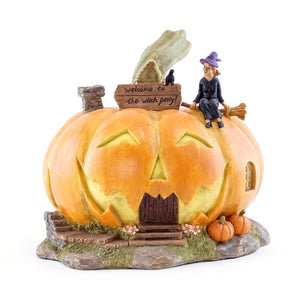 A craggy, wooden door can be seen under the jack o'lantern's grin. Its occupant, the old witch, sits upon the roof (she's flown there on her broom) to keep an eye on anyone who approaches. And approach they will, because as the sign resting on the pumpkin stem declares, a witch party is in progress!