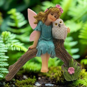 Fairy Layla is beautifully crafted, sitting gracefully on a tree branch beside her magnificent snowy owl companion. Dressed in a delicate blue dress, with long blonde hair adorned with a flower crown, she radiates charm and elegance. Her soft pink wings add a gentle, whimsical touch, making her a delightful figure for any fairy gardening scene.