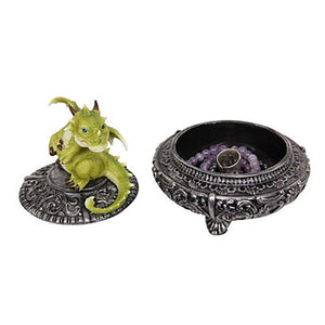 A set of two trinket boxes for hiding treasure, with this lovely green dragon sitting on top and keeping careful guard.