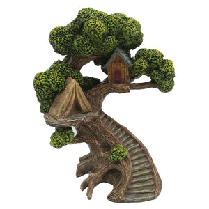 Introduce a touch of magic to your fairy garden with our Enchanted Tree House. This charming fairy abode is crafted to resemble a beautiful tree, complete with steps carved into its twisted trunk. At the top, you'll find a cozy little tent, perfect for your fairy friends to rest. Nestled further up in the branches is a delightful cabin, featuring a small door and a blue roof, offering a perfect hideaway.
