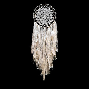 To sleep perchance to dream... The Ethereal Dream Catcher is a romantic dream catcher, with a crocheted web and decadent lacey tail. A mystical addition to any room, the dream catcher, when hung over or near a bed or window, catches the dreams as they flow by. The good dreams know how to slip through the holes and slide down the feathers of the dream catcher to the dreamer.