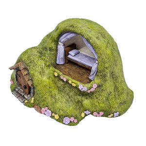 A hobbit style house for your fairies, elves or gnomes. This house features a little alcove with a built in bed. Its little door opens and closes and the fairies come and go.
