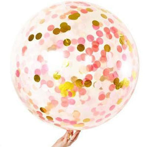 A clear latex balloon filled with jumbo confetti ready to be inflated. Balloon supplied flat.