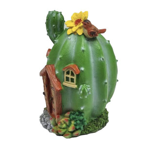 The fairies will keep cool in Krankle's cactus fairy home. Leading up the stone stairs is a wooden door left ajar (door is non-opening). A sweet bird friend is perched next to the flower on top of the cactus, and some pretty succulents & rustic fence sit at the base.