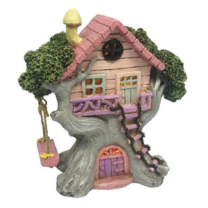 This is a very sweet fairy house! A little boarded pink cottage has been set amongst the branches of a tree, it even has a little pink timber roof. A rope ladder has been thrown against the trunk for access, and a little, moving swing hangs to the side. Team with other fairies and accessories from the charming Willow Collection