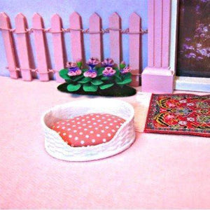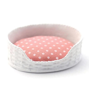 Made from woven wicker, this little white pet bed has a padded pink fabric cushion.