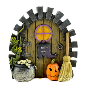 This spooky door belongs to the resident fairy garden witch.  The door has a heavy, wooden appearance and is decorated with a witch's broomstick, a jack-o-lantern and a cauldron.