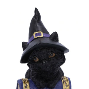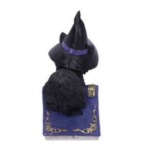 This set of 2 witchy cats are feeling playful, resting upon their spellbooks. They have witch's hats on their heads, and a large silvered spider decorates the grimoire. This set is the perfect gift for the witch in your life.
