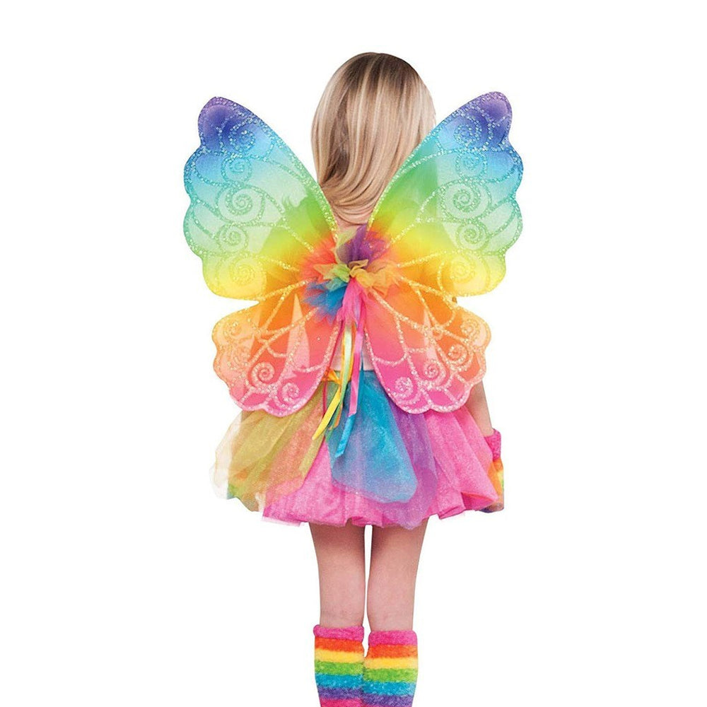 Featuring an elegant shape, and vibrant rainbow hues, these Rainbow Fairy Wings are a favourite with children and parents alike. These pretty wings are excellent quality and the sparkle will make them an instant hit. Adorned with mesh rosettes at the centre they also have a trail of rainbow coloured ribbons. Great value, sized for children, but also suitable for adult wear.