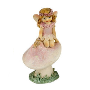 Another beautiful set of figurines from our Flower Garden Fairy Collection, this time depicting three little fairies perched upon mushrooms, each with their own little difference. The first fairy wears a blush pink dress and gazes sweetly at a little green frog by her side. The next fairy wears a halo of flowers and has a little bird perched nearby. The last fairy wears a mint coloured dress and holds up a lovely bloom to be admired.