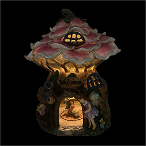 Welcome to Flower Hollow, a magical fairy home that glows warmly at dusk to invite tiny visitors in for the night. With its soft pink petal roof, mossy details, and welcoming fairies at the door, this enchanting solar-powered house brings a storybook scene to life in your garden.